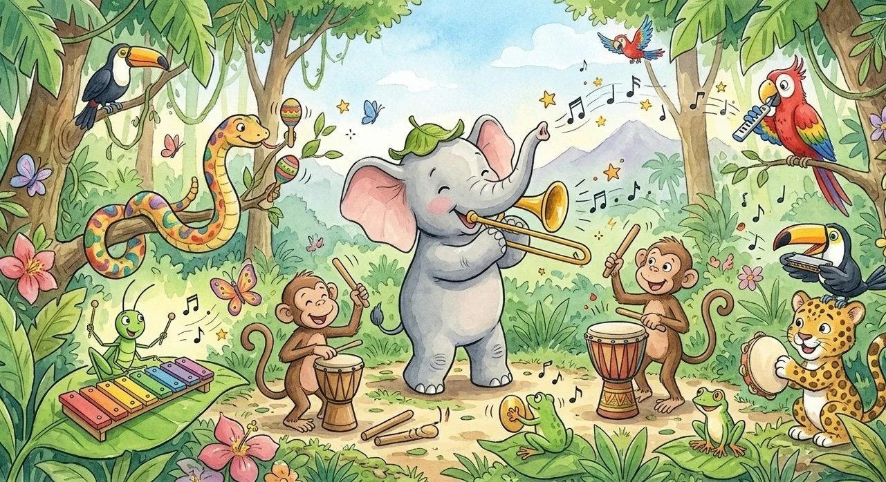 Begleite den kleinen Elefanten auf seiner musikalischen Reise durch den Dschungel, wo er viele neue Klänge und Freunde kennenlernt. Jede Woche treffen wir ein neues Tier und probieren gemeinsam aus, wie es am liebsten musiziert. Mit immer wieder neuen Instrumenten bringen wir den Urwald zum Klingen!
